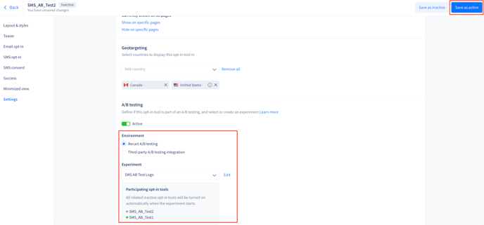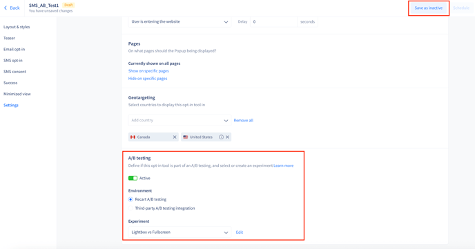 You will find the dedicated A/B testing section inside the Opt-in Tools dashboard.