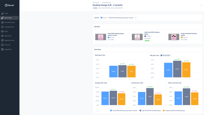 Once a test ends, Recart will automatically calculate which popup performed best. You can view performance by: