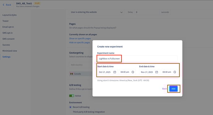 To run an A/B test in Recart, you’ll need two popups: one new variant and one that’s currently active. You’ll assign both to the same experiment so Recart can automatically split traffic and compare performance. First, you’ll create a new popup with the changes you want to test, then assign your current active popup to the same experiment.