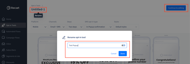 In your Recart dashboard, go to Opt-in Tools → Create New in the upper right corner.