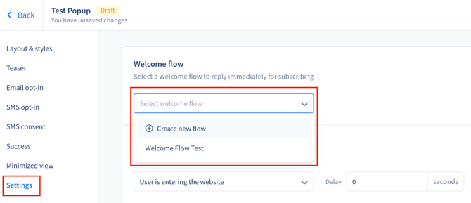 Link your Popup to a Welcome flow (or create a new ) to ensure new subscribers immediately receive your first automated message or campaign.